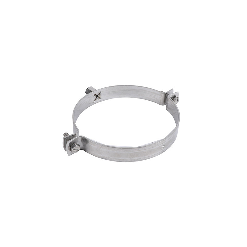 Abrazadera que cuenta con doble rosca y está diseñada para ser utilizada en entornos corrosivos. La tuerca soldada ha sido sometida a un proceso de pulido para mejorar su resistencia frente a la corrosión. Además, incorpora tornillos de seguridad con arandelas anti-pérdida. El material utilizado es acero inoxidable 1.4401 (AISI 316).