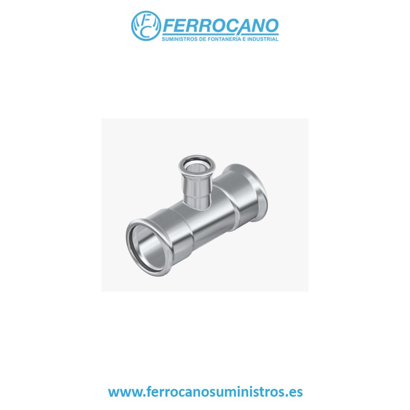 Conexión en forma de T fabricada en acero inoxidable de alta calidad para sistemas de fontanería y calefacción. Este accesorio de T inox press reducida está diseñado para unir tres tuberías con diámetros diferentes, ofreciendo una conexión segura y resistente a la corrosión. Ideal para instalaciones que requieren una solución duradera, fiable y fácil de instalar.