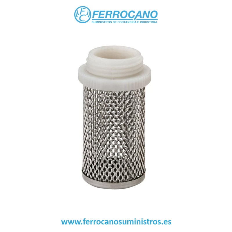 Está construido con una red de acero inoxidable y una parte roscada hecha de polímero.