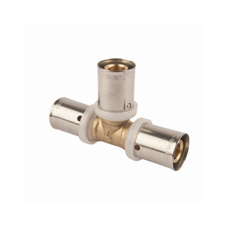 TE multicapa con un diámetro de 32 mm. Está fabricado con accesorios de primera calidad de latón CW617N, cumpliendo con las normas UNE-EN 1254 y UNE-EN ISO 21003. El casquillo, diseñado para compresión mecánica, está hecho de acero inoxidable AISI 304, marcado con el diámetro y el espesor de la tubería. Para facilitar la verificación de la correcta instalación del tubo hasta su tope, el casquillo cuenta con tres visores ópticos.