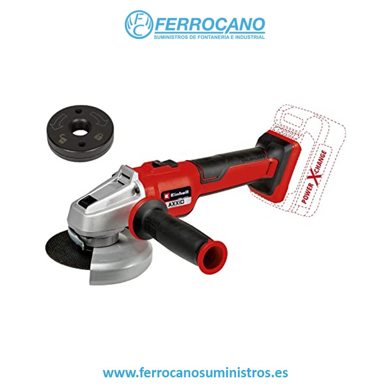 La amoladora angular con batería Einhell Axxio 18/125 Q prueba su eficacia como ayudante al trabajar en el taller, hogar y garaje. Potente, sin cables y cómoda: estas son las características a las que se otorgó una gran importancia durante su concepción. La amoladora angular forma parte de la familia Power X-Change, en la que la batería se puede utilizar en todos los dispositivos de la serie. La batería 2,5 Ah Plus y las baterías más potentes de la serie ofrecen unos resultados óptimos. El motor sin escobillas ofrece más potencia y, por lo tanto, un tiempo de funcionamiento más prolongado. Arranque suave y protección contra rearranque para una mayor seguridad del usuario. Se puede trabajar de forma agradable gracias a la forma constructiva esbelta con agarre suave ergonómico y empuñadura adicional. El desacoplamiento del motor y la transmisión garantiza un funcionamiento suave. La protección del disco con ajuste rápido posibilita un trabajo flexible La empuñadura auxiliar se puede montar de forma flexible en dos posiciones. Con la ranura de fijación rápida ya no se necesita una llave de espigas para el cambio de disco de corte: El cambio se realiza de forma rápida y sin herramientas. La amoladora angular con batería está equipada con una protección frente a sobrecargas. Se ha prestado atención a la larga duración con la robusta carcasa de engranajes de aluminio. La entrega se realiza sin batería ni cargador. También se puede adquirir por separado un disco de corte adecuado (diámetro de disco 125 mm).