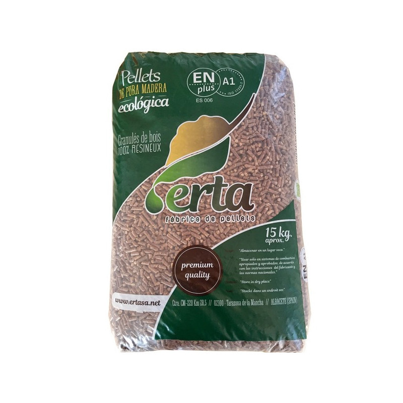 Pellet de Madera 100% Natural EN-PLUS A1 Saco 15kg ERTA es la solución perfecta para un combustible ecológico, eficiente y de alta calidad. Mejora tu consumo energético y cuida el medio ambiente con los pellets de ERTA.