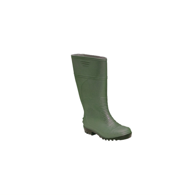 Bota de agua alta, talla 45, de PVC verde con puntera y plantilla de protección metálica. Fabricada con caucho nitrilo que ofrece una notable resistencia a grasas, aceites e hidrocarburos. Cuenta con puntera de acero antiimpactos de 200 Julios y suela de PVC.