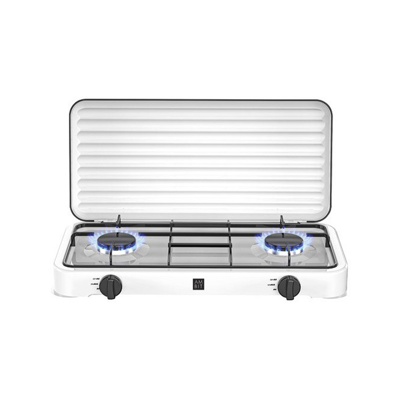 La cocina de gas Ambit con tapa de 2 fuegos es la opción perfecta para camping, caravanas, casas de campo o como apoyo en tu cocina. Compacta y funcional, ofrece la potencia necesaria para preparar tus comidas al aire libre con total comodidad.