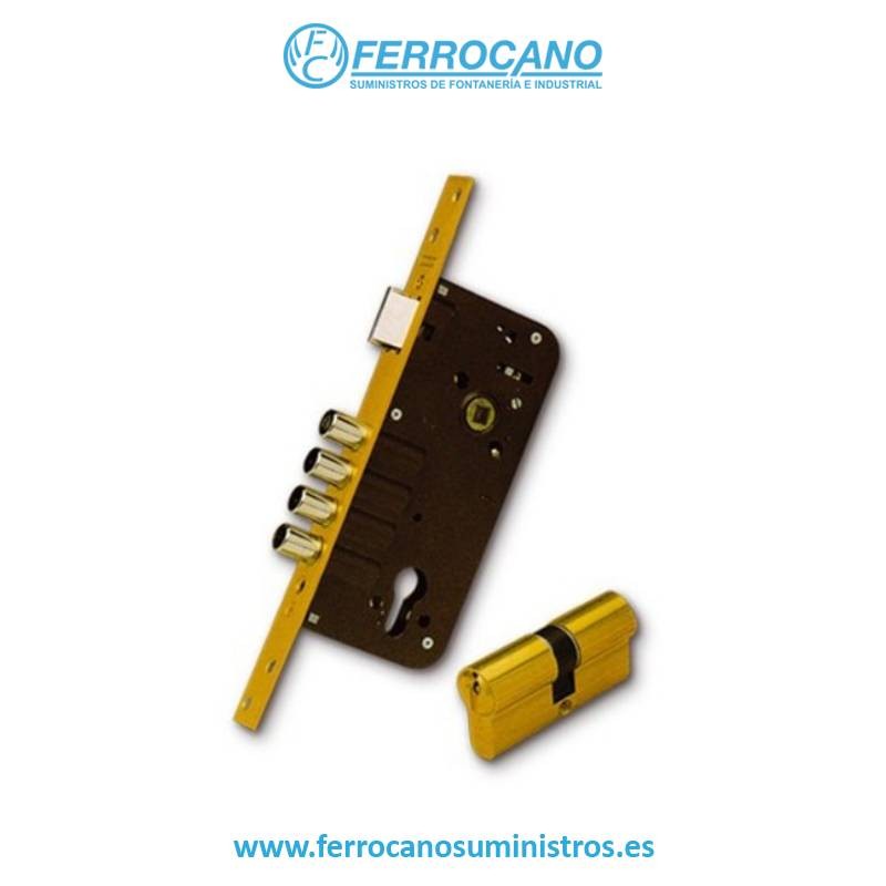 Una cerradura empotrada de un solo punto, que incluye un picaporte y una palanca con cuatro bulones, y un cilindro de perfil europeo.