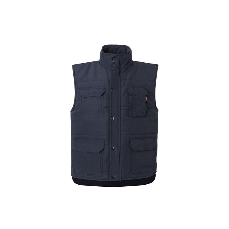 Chaleco trabajo acolchado con cierre central mediante cremallera oculta bajo una tapeta con botones automáticos. Incluye múltiples bolsillos exteriores con cierre de tapeta y velcro, además de una banda elástica en el interior de los laterales de la cinturilla.