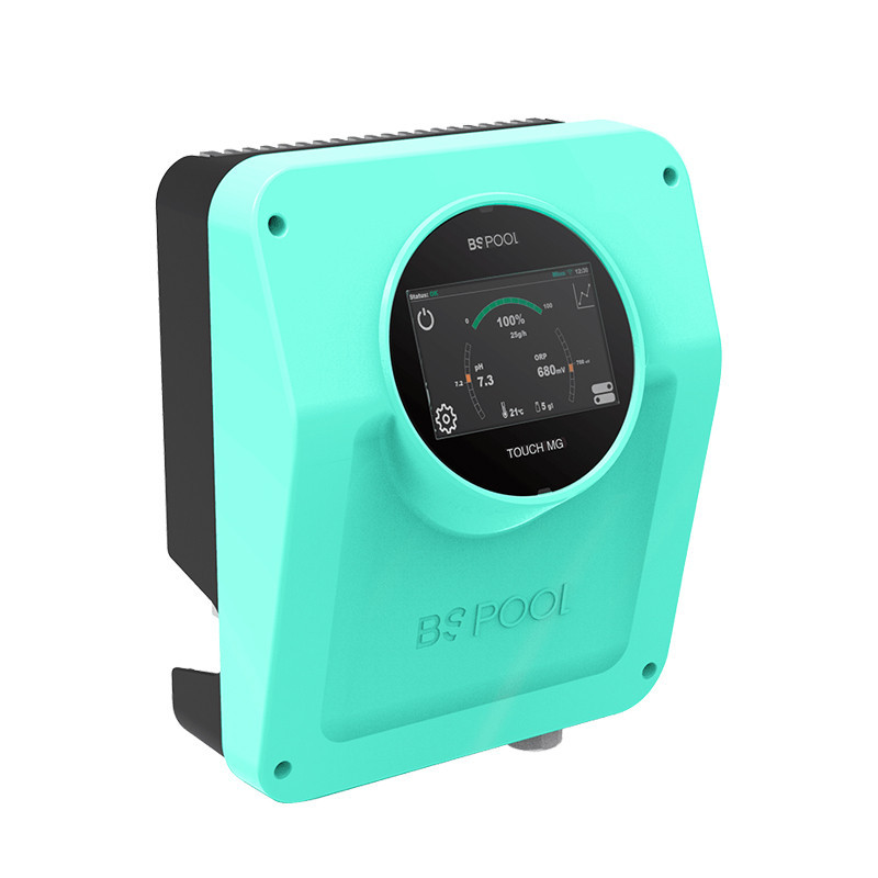 Descubre TouchMG, el clorador compacto líder en innovación, equipado con un moderno display táctil y funciones domóticas avanzadas. Este dispositivo está diseñado para piscinas privadas que contienen magnesio, ofreciendo capacidades de producción de sal de 15, 25 y 35 gramos.