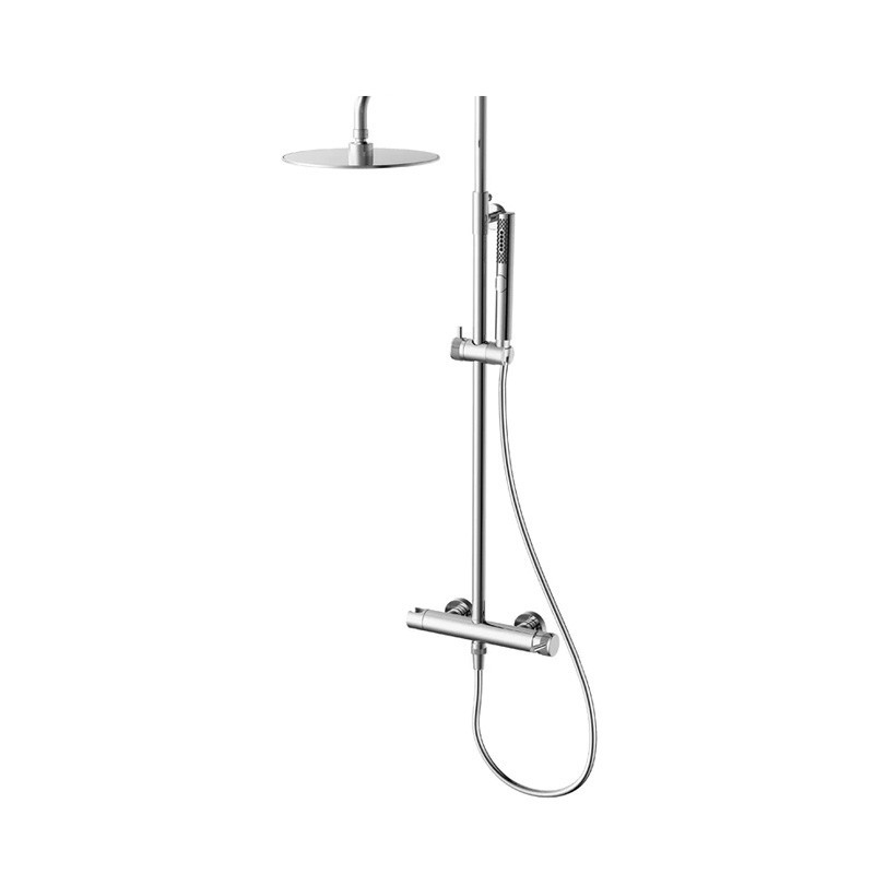 Conjunto de ducha con distribuidor integrado en la parte inferior de la grifería. Barra extensible 86-122cm. Rociador redondo de Acero Inox.S304 de 20cm. Ultrafino y antical. Soporte de mango de ducha de latón, orientable y ajustable. Flexo de PVC 1,5m. Mango de ducha redondo con pulsador de 3 funciones.