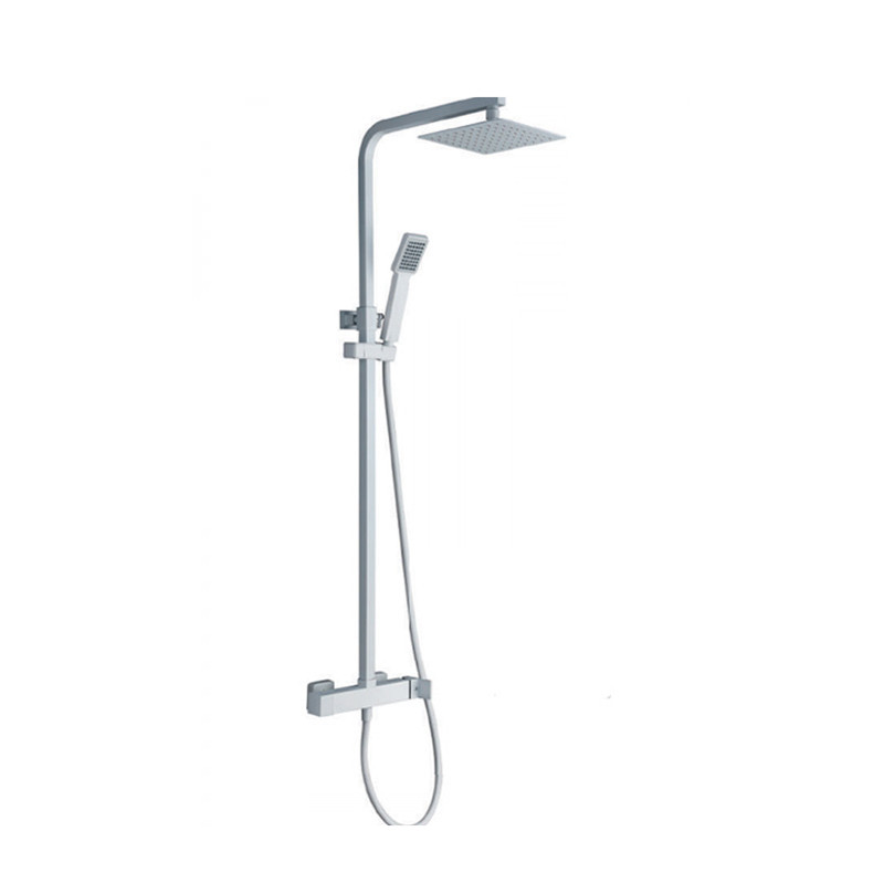 El mango de ducha cuadrado y la grifería de latón blanco mate añaden un toque moderno y sofisticado, mientras que el distribuidor cuadrado integrado de latón y el flexo de PVC blanco mate de 1,5 m brindan flexibilidad y durabilidad. El cartucho monomando cerámico de 35 mm garantiza un control preciso del caudal, que es de 12 l/min, ideal para una ducha eficiente y relajante.