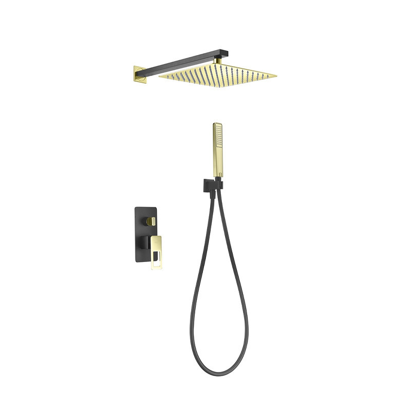 El tubo de salida de pared está fabricado en latón negro mate con detalles en oro brillo, aportando durabilidad y estilo. El mango de ducha cuadrado y la grifería monomando de 2 vías en latón negro mate y oro brillo aseguran un control preciso del caudal (12 l/min) y una estética sofisticada.