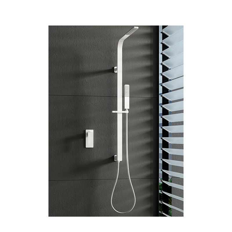 La ducha monomando blanco bate de la serie Bahamas de IMEX está diseñada para ofrecer tanto funcionalidad como estilo moderno. Este conjunto cuenta con una barra de latón en blanco mate que integra un rociador con distribuidor incorporado y una entrada de agua a pared.