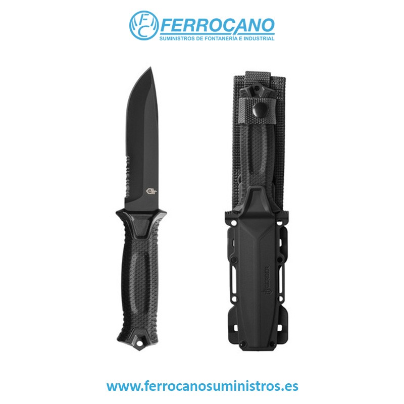 El Gerber StrongArm es un cuchillo táctico y de supervivencia que cuenta con hoja de acero 420HC con revestimiento cerámico negro. La empuñadura está fabricada en polímero de color coyote e incluye una punta rompecristales. El cuchillo se sirve junto con una funda de kydex con sistema molle para poder portar tanto horizontal como vertical.