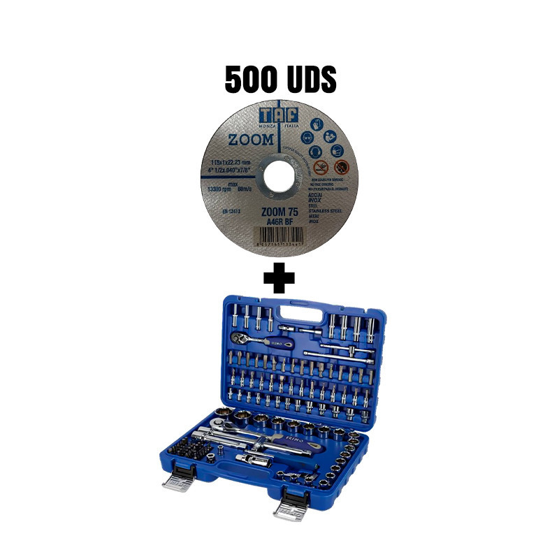 Por la compra de 500 unidades de discos de corte TAF 125X1X22 ZOOM75-A46R, te regalamos un juego de 115 vasos y llaves de 1/4 y 1/2.