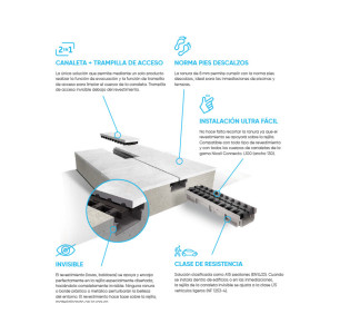 - Sistema 2 en 1: canaleta de drenaje + trampilla de registro con un solo producto.