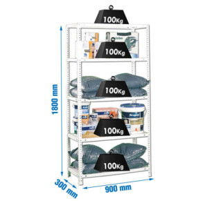 Estanteria metalica con tornillos de color BLANCO con capacidad de carga por estante de 100 kg. El numero de estantes es 5 y las medidas (alto x ancho x fondo) son 1800x900x300 mm. La ultima bandeja no debe superar los 10 cm de distancia con respecto al suelo. Producto europeo, calidad europea, podras encontrar las instrucciones de montaje en su interior o en este enlace: https://www.youtube.com/watch v=qmx57bCt7qc. Medidas en uso del producto: 1800x910x310 mm