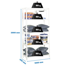 Estanteria metalica con tornillos de color BLANCO con capacidad de carga por estante de 90 kg. El numero de estantes es 5 y las medidas (alto x ancho x fondo) son 1800x1100x300 mm. Sin riesgo de manipulacion, no contiene aristas de corte. No se tambalea. La ultima bandeja no debe superar los 10 cm de distancia con respecto al suelo. Producto europeo, calidad europea, podras encontrar las instrucciones de montaje en su interior o en este enlace: https://www.youtube.com/watch v=qmx57bCt7qc