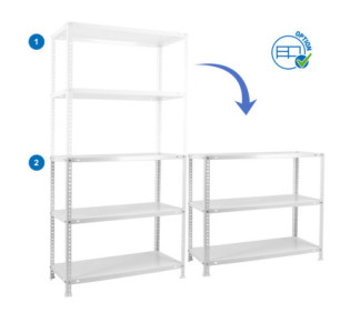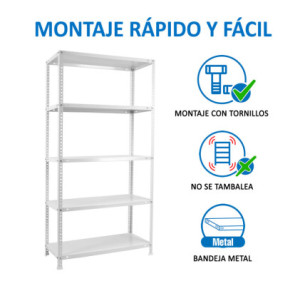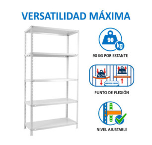 Estanteria metalica con tornillos de color BLANCO con capacidad de carga por estante de 90 kg. El numero de estantes es 5 y las medidas (alto x ancho x fondo) son 2000x1100x500 mm. La ultima bandeja no debe superar los 10 cm de distancia con respecto al suelo. Producto europeo, calidad europea, podras encontrar las instrucciones de montaje en su interior o en este enlace: https://www.youtube.com/watch v=qmx57bCt7qc. Medidas en uso del producto: 2000x1110x510 mm