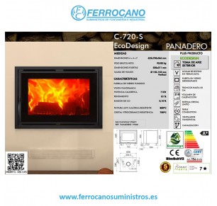 La estufa de leña Panadero modelo Insert C-720-S combina un diseño encastrable con eficiencia energética, ideal para calentar espacios de hasta 220 m³ de manera sostenible. Con una potencia nominal de 7 kW y un rendimiento del 81 %, esta estufa es perfecta para quienes buscan una solución de calefacción elegante y eficiente.