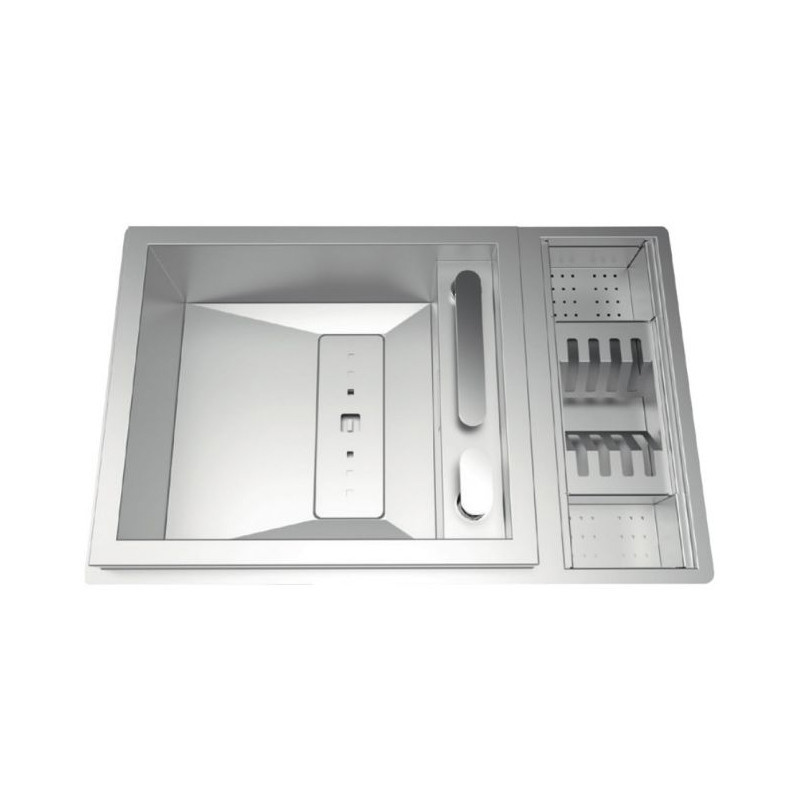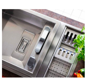 Fregadero de diseño INVICTUS con acabado en acero cepillado, que presenta un estilo moderno y elegante con líneas rectas y un radio de 0 mm. Destacado por su altura y funcionalidad excepcional, este fregadero ha sido galardonado por su diseño innovador. Viene equipado con un escurridor y diversos accesorios, así como un grifo retráctil para mayor comodidad.