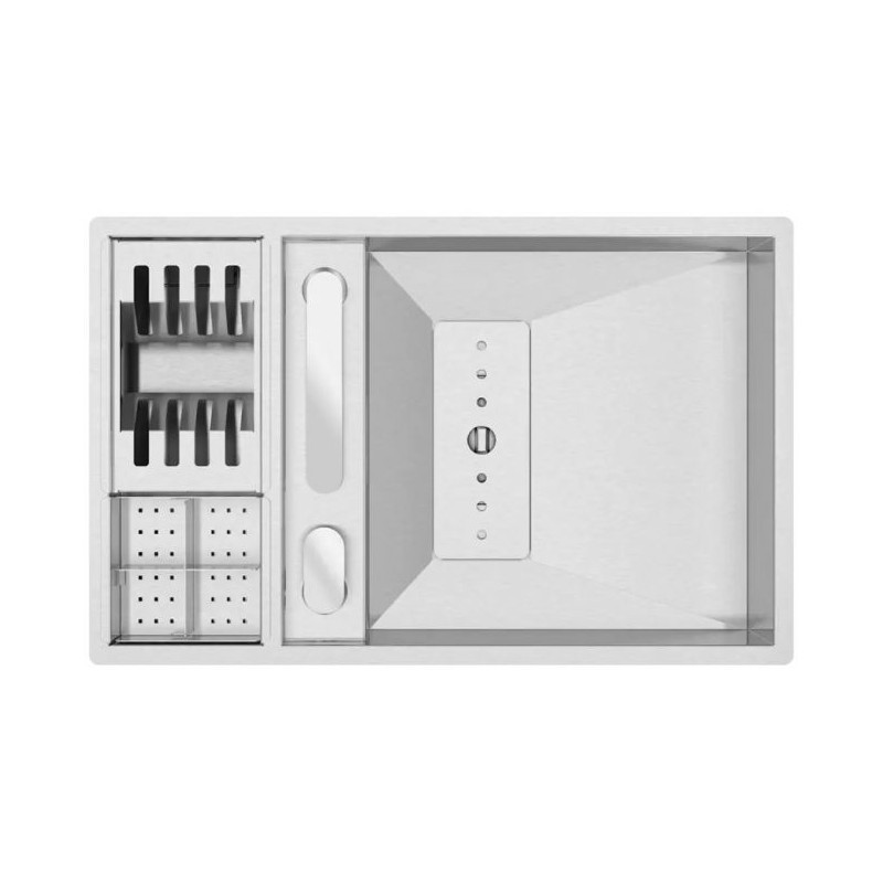 Fregadero de diseño modelo invisible 70, con dimensiones de 690x440mm, acabado en acero cepillado de la marca RODI. Presenta una cubeta sin radio aparente y cuenta con un grifo retráctil incorporado. La válvula rectangular incluye una tapa de diseño exclusivo.