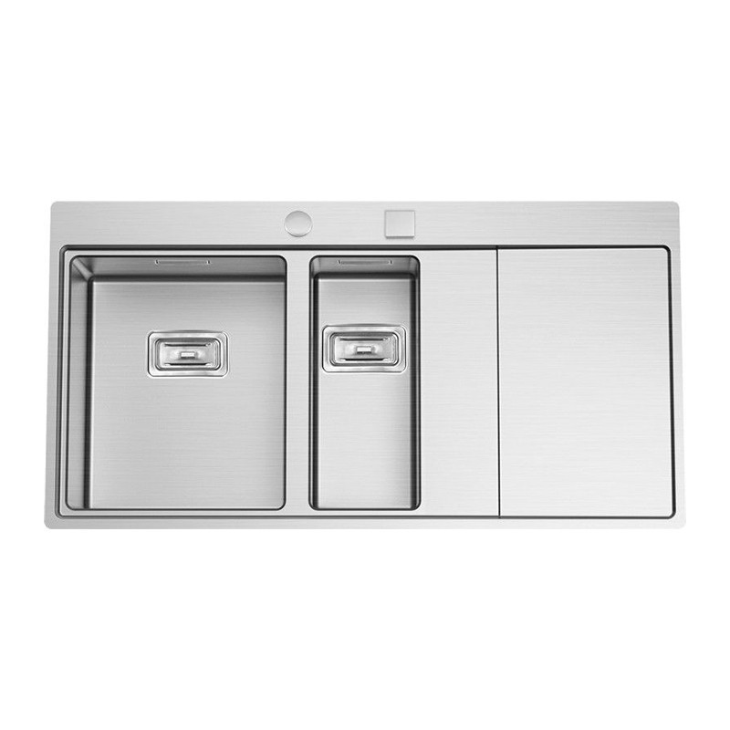 El fregadero Xeron 100 presenta una cubeta y media y está fabricado en acero satinado cepillado, con un radio de 12 mm. Su diseño minimalista permite la incorporación de varios accesorios que mejoran su versatilidad y utilidad.