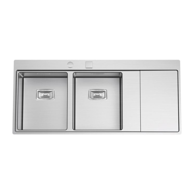 Fregadero de doble cubeta XERON 116, fabricado en acero inoxidable satinado, con un radio de 12 mm. El diseño sencillo de esta serie permite la incorporación de varios accesorios para mejorar su utilidad.