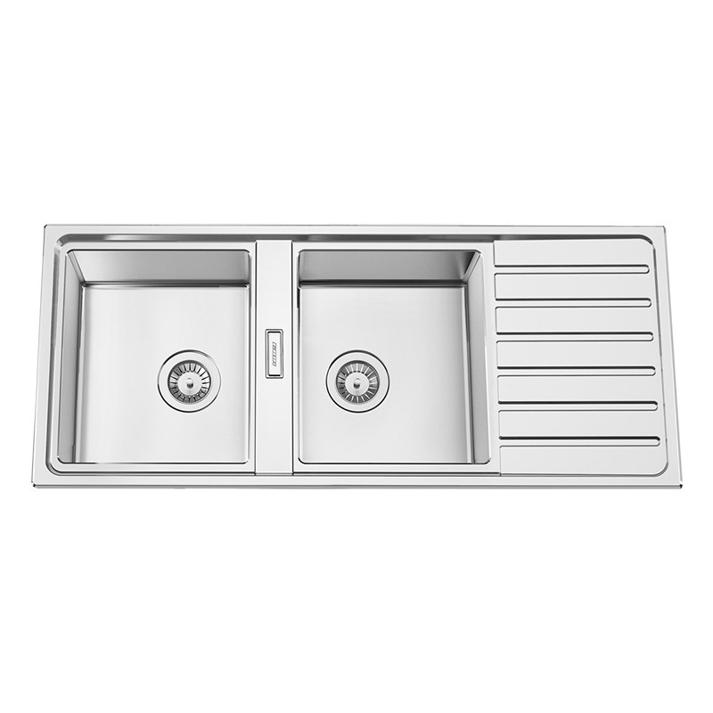Fregadero Fusion 116 con medidas de 1160x500mm, fabricado en acero pulido de la marca RODI. Es un fregadero reversible con dos cubetas de radio de 12mm, diseñado para ser encastrado.
