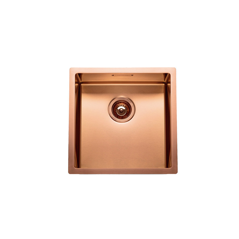 El fregadero Box Lux 40 400x400x200 con acabado bronce de RODI ofrece una cubeta de líneas rectas y diseño minimalista, con un radio de 12mm y válvula redonda. Presenta un acabado con revestimiento cerámico de alta adherencia, dureza y resistencia (PVD) en un atractivo color cobre.