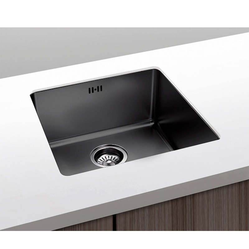 El fregadero de la serie BERLIN de Plastimodul, en elegante acabado PVD negro arenado y dimensiones de 45x40 cm, es una opción de alta calidad, simple y práctica que refleja un estilo de vida moderno. Fabricado en acero inoxidable AISI 304, presenta un acabado liso y brillante con un tacto suave y sedoso. Su diseño elegante se caracteriza por ángulos y bordes limpios y definidos, ofreciendo una gran uniformidad y suavidad.