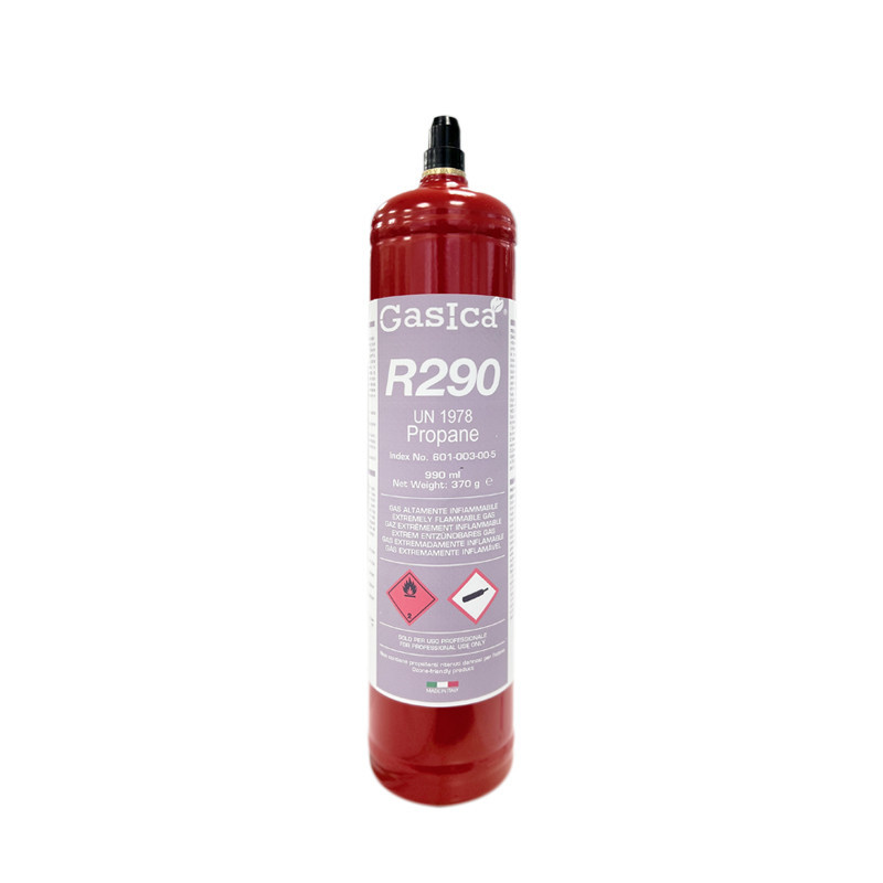 Carga de gas refrigerante Gasica de 370 gramos, formulado con propano (R290). Esta alternativa ecológica y eficiente es adecuada para diversas aplicaciones de refrigeración y aire acondicionado.