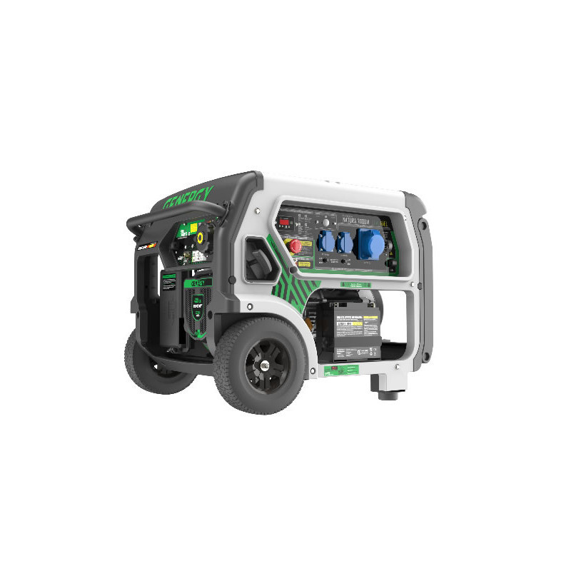 El generador modelo NATURA-7000 ofrece una potencia de 7000W a 230V y puede funcionar con gas y gasolina, con un arranque eléctrico para mayor comodidad. Está equipado con el motor GENERGY SGE series, diseñado para un rendimiento profesional y garantizando eficiencia y durabilidad.