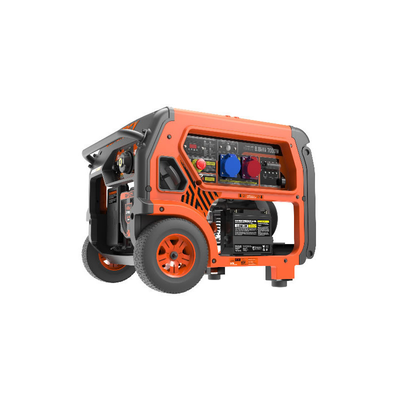 El modelo FORMIGAL es un generador potente que ofrece una capacidad de salida de 7000W a 400V y 6500W a 230V, funcionando con gasolina y con arranque eléctrico trifásico. Destaca por su diseño moderno y atractivo, con un carenado externo resistente de plástico sobre un sólido bastidor interno metálico que brinda una protección completa de 360º al conjunto motor-alternador.