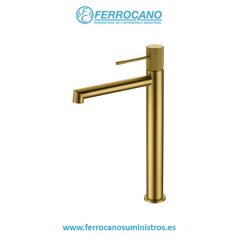 Grifo monomando de lavabo alto con acabado en oro cepillado de la serie LINE de IMEX. Fabricado en latón de alta calidad y equipado con un cartucho cerámico de 35 mm. Incluye latiguillos de 3/8. Ideal para añadir un toque de lujo y elegancia a tu baño.