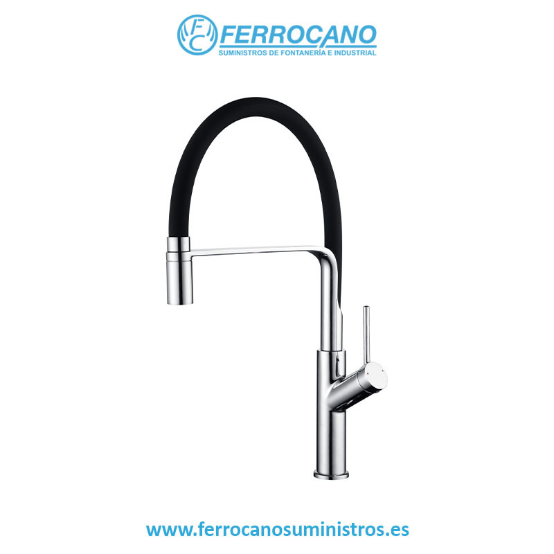 Cuerpo de grifería en latón cromado y caño flexible negro mate.