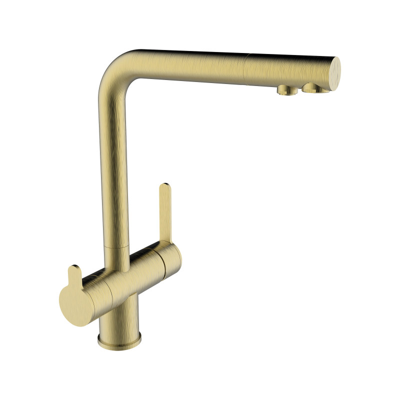 Grifo de cocina monomando 3 vías con 2 mandos y 2 salidas de agua para equipos de tratamiento del agua Nexus Oro Cepillado Extraíble Cold Open
