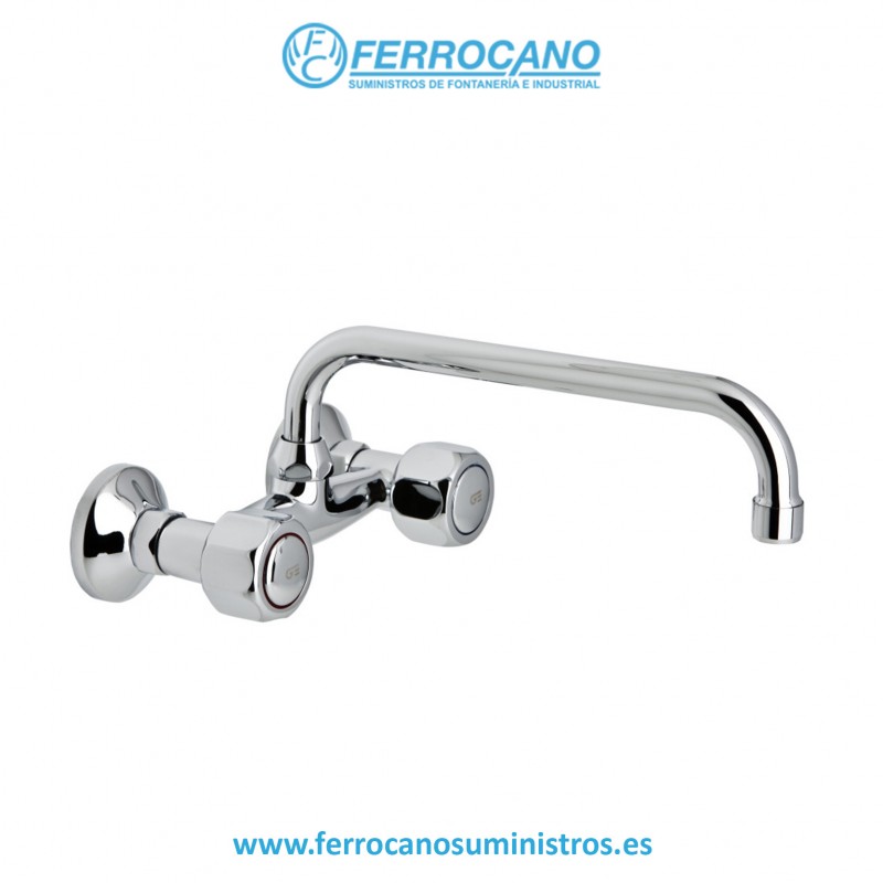 Grifo tipo batería de pared con distancia entre ejes de 150 mm y caño largo. Fabricado con materiales de alta calidad, ofrece durabilidad, control preciso del flujo de agua y mayor alcance para fregaderos o lavaderos.