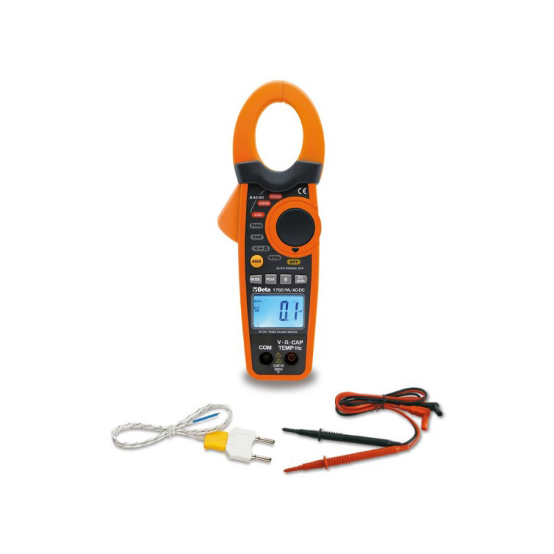 Pinza amperimétrica y multímetro digital BETA con capacidad para medir corriente continua y alterna de hasta 1000 A.