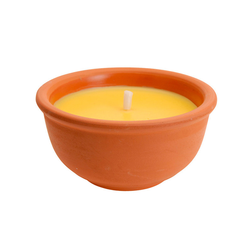 Vela de citronela repelente de mosquitos con un recipiente de barro, con dimensiones de Ø13x6,5cm (diámetro/alto), en un atractivo color terracota.