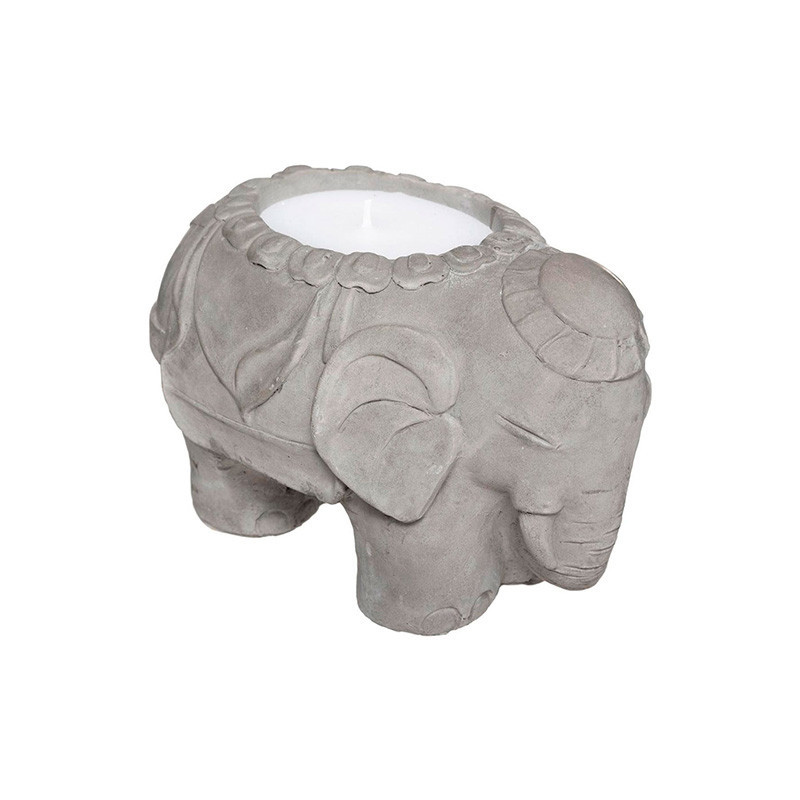 Vela con aroma a citronela para decoración, contenida en un envase de cemento con forma de elefante, con un peso de 180 gramos. Tiene una duración estimada de unas 16 horas y sus medidas son aproximadamente 10x16,5x11cm (ancho/fondo/alto), en un tono gris elegante.