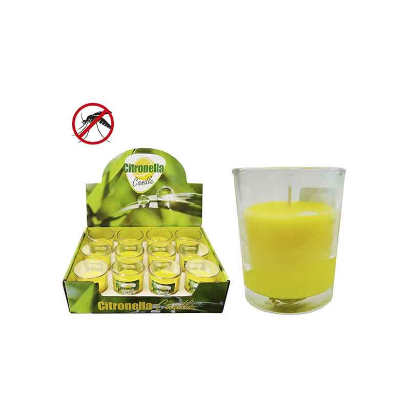 Vela de citronela en un recipiente de cristal, con un peso de 50g. Sus dimensiones son Ø6x5cm (diámetro/alto) y su color es transparente. Ideal para repeler mosquitos.