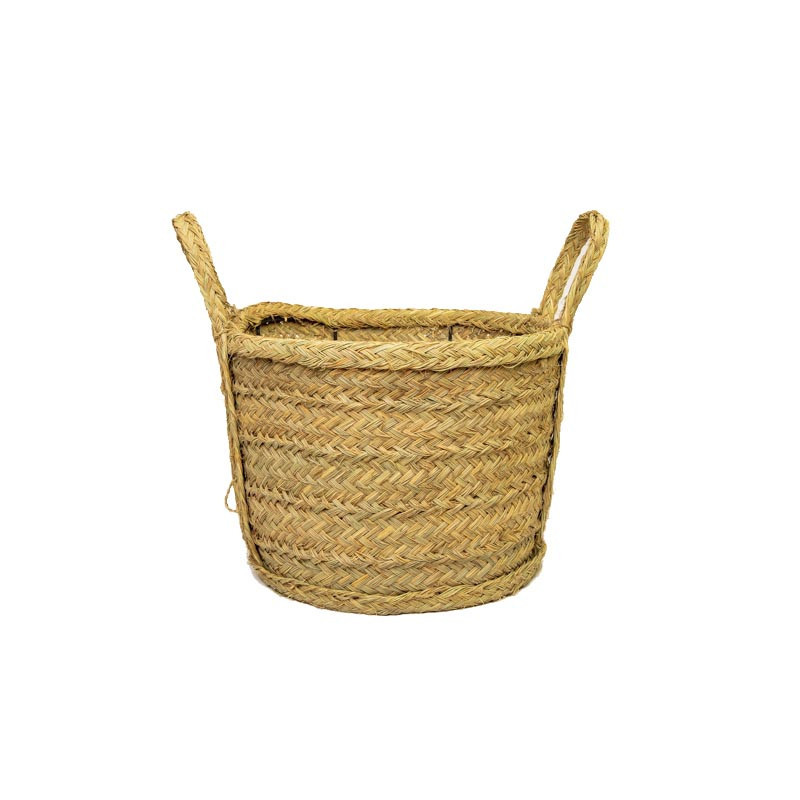 - Leñero de diseño redondo elaborado con esparto natural, ideal para almacenar y transportar leña con un toque rústico y decorativo.