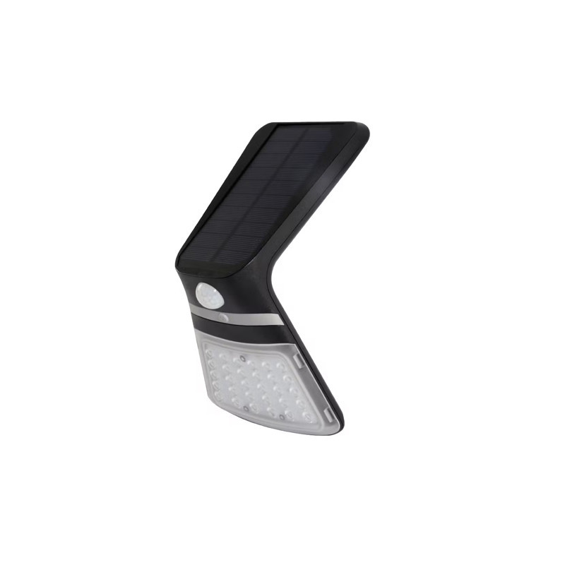 El aplique solar de 3,5W con una luminosidad de 430lm, protección IP65 y acabado en color negro, está equipado con una batería recargable de 3,7V/2300mAh (REF:38110) y cuenta con un sensor de presencia con un rango de detección de 2 a 8 metros. Ofrece dos tonalidades de luz: una luz frontal de 6000K de temperatura de color fría y una luz posterior de 3000K de temperatura de color cálida. Este dispositivo dispone de encendido automático durante la noche y apagado automático durante el día. Ofrece dos modos de iluminación: en el Modo A, sin detección de movimiento la luz frontal se enciende al 20% y la luz posterior al 100%, mientras que con movimiento ambas luces se encienden al 100%; en el Modo B, sin detección de movimiento la luz frontal se apaga y la luz posterior se enciende al 100%, mientras que con movimiento ambas luces se encienden al 100%. Además, el Modo A se activa automáticamente cuando la carga es superior al 30%, mientras que el Modo B se activa automáticamente cuando la carga es inferior al 30%. Sus dimensiones son de 10,5x13cm (ancho/fondo/alto) y es un producto de la marca EDM.