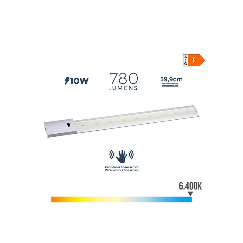Una regleta LED equipada con un sensor de proximidad, con una potencia de 10W y una luminosidad de 780lm en tono de luz fría de 6400K, ofrece una iluminación eficiente y duradera. Con un ángulo de apertura de 110° y clasificación de protección IP20, esta regleta viene con soportes, lo que la hace ideal para su uso en muebles de cocina, armarios, y más. Con unas medidas de 5,5x59,9cm (ancho/fondo), esta regleta de la marca EDM opera con un voltaje de 220-240V y tiene una vida útil de hasta 25.000 horas.