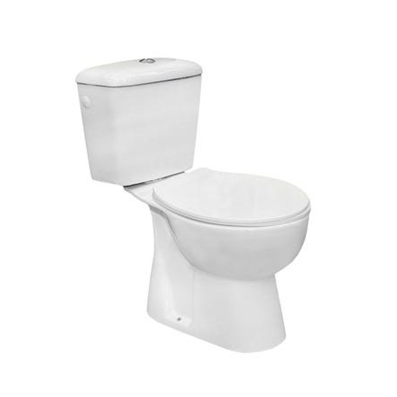 Inodoro completo del modelo ROMA con tapa amortiguada, salida vertical y alimentación lateral por ambos lados, así como un acabado de calidad.