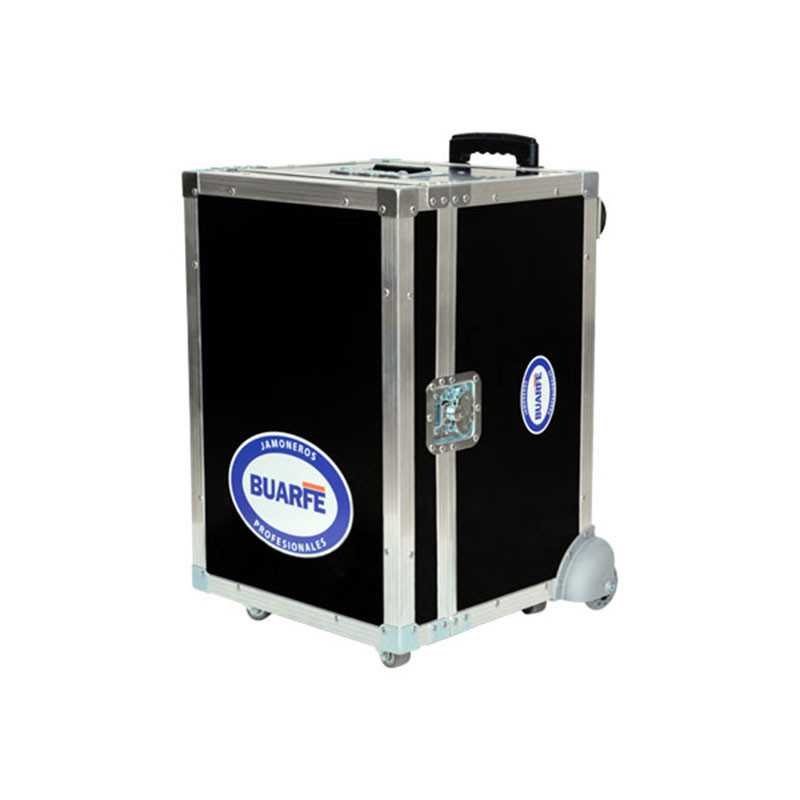 Esta maleta está diseñada específicamente para adaptarse a todas las versiones del Jamonero Elite. En su interior, cuenta con un forro de goma espuma que garantiza la protección de las piezas del jamonero, alzador y cuchillos. Además, se puede personalizar con vinilo según las preferencias del cliente, haciendo cada maleta única.
