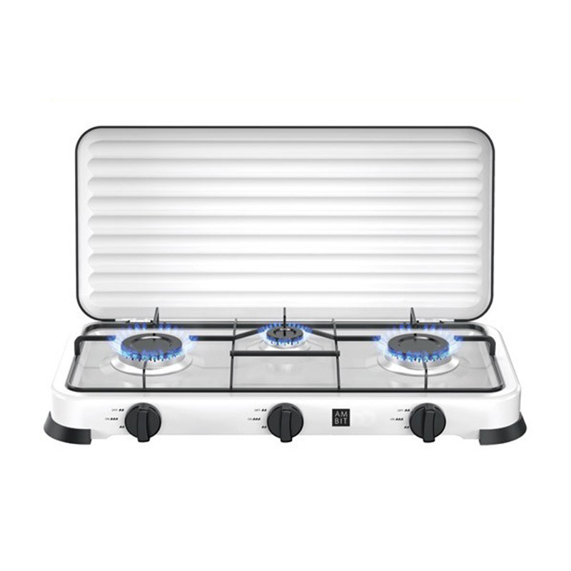 Compacta, segura y eficiente, la cocina de gas Ambit 3 fuegos con tapa es la mejor aliada para disfrutar de comidas caseras en camping, viajes o exteriores.