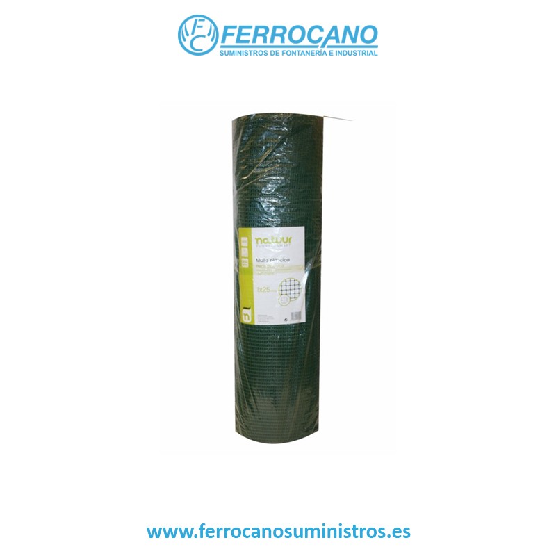 Malla de protección de plástico con dimensiones de 1x25 metros. Tiene una estructura cuadrada con una abertura de malla de 11x11 mm y está disponible en color verde.