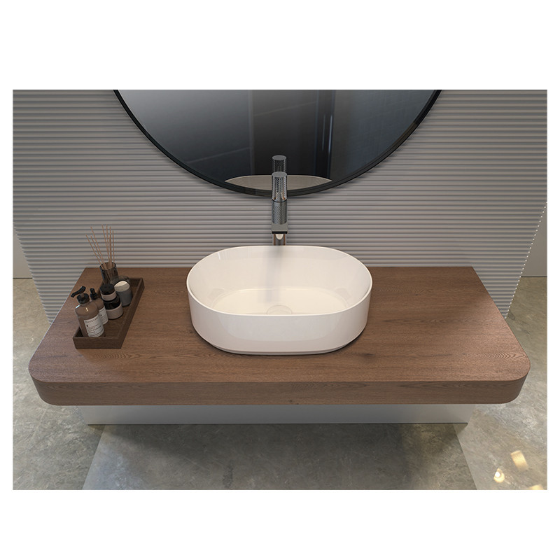 Un lavabo sobre encimera blanco con medidas compactas y diseño actual, ideal para crear un ambiente de baño moderno y funcional.