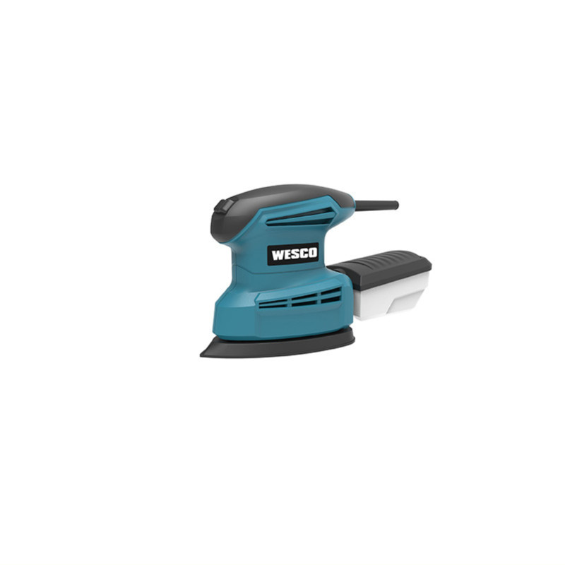 Lijadora Delta de 160W con base de tamaño 140x140x80mm. Equipada con un sistema de sujeción de gancho y bucle y una caja recolectora de polvo altamente eficiente, además de una empuñadura de goma para mayor comodidad.