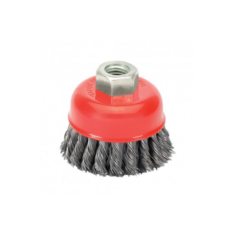 Cepillo de copa trenzada diseñado para amoladoras angulares con una velocidad máxima de 8,500 rpm. Con un diámetro de 100 mm y fabricado en acero gris de 0,80 mm de espesor. Equipado con rosca M-14, esta herramienta es ideal para trabajos exigentes, ofreciendo una gran capacidad de arranque y limpieza de paneles de encofrado.